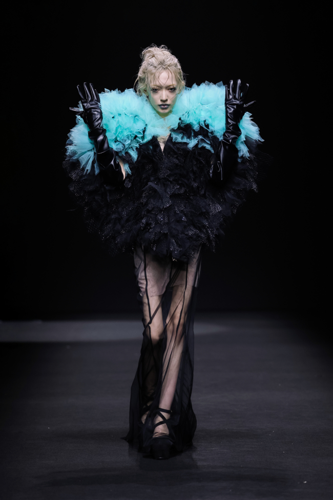 剪裁上巧妙融合神话生物的形态特征:不对称层叠裙摆似汹涌浪涛,缀满珍珠与金属鳞片的紧身胸衣勾勒出身体曲线,拖尾设计则如海妖舒展的尾鳍,赋予穿着者灵动而充满张力的姿态。整个系列既保留了礼服的优雅华贵,又通过夸张廓形与奇幻元素,打破现实与传说的界限,塑造出宛如从神话中走出的深海精灵形象。